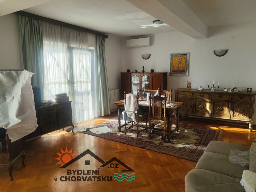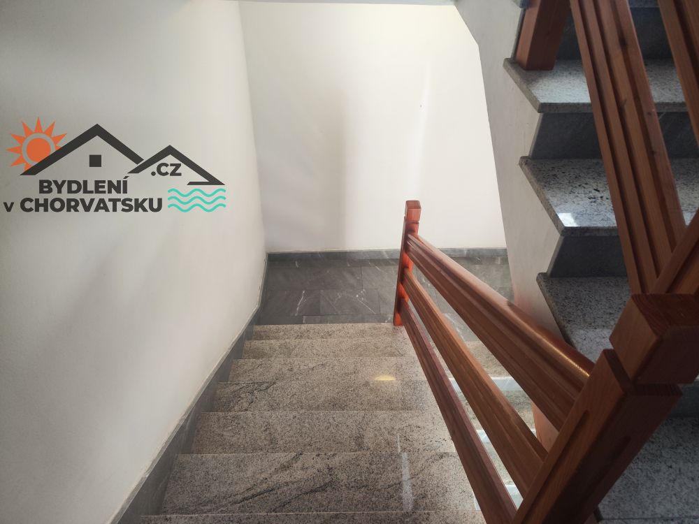 U povišenom prizemlju se nalazi trosoban stan s dnevnim boravkom, kuhinjom, dva kupatila i velikom terasom. Stan ima 145 m2, centralnom grijanje i dvije klime.