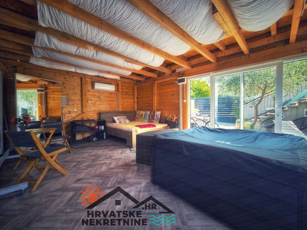 U prizemlju se nalazi manji objekt (cca 30 m2), koji je uređen kao spavaća soba s jacuzzijem. Kuća je podijeljena na dva dijela, tako da ima odvojene ulaze. Nekoliko metara od kuće nalaze se dva parkirna mjesta na vlastitom zemljištu. Kuća je na dobroj lokaciji i udaljena je 350 metara od mora. Velika prednost je blizina splitske zračne luke, tako da gosti mogu doći i avionom.
